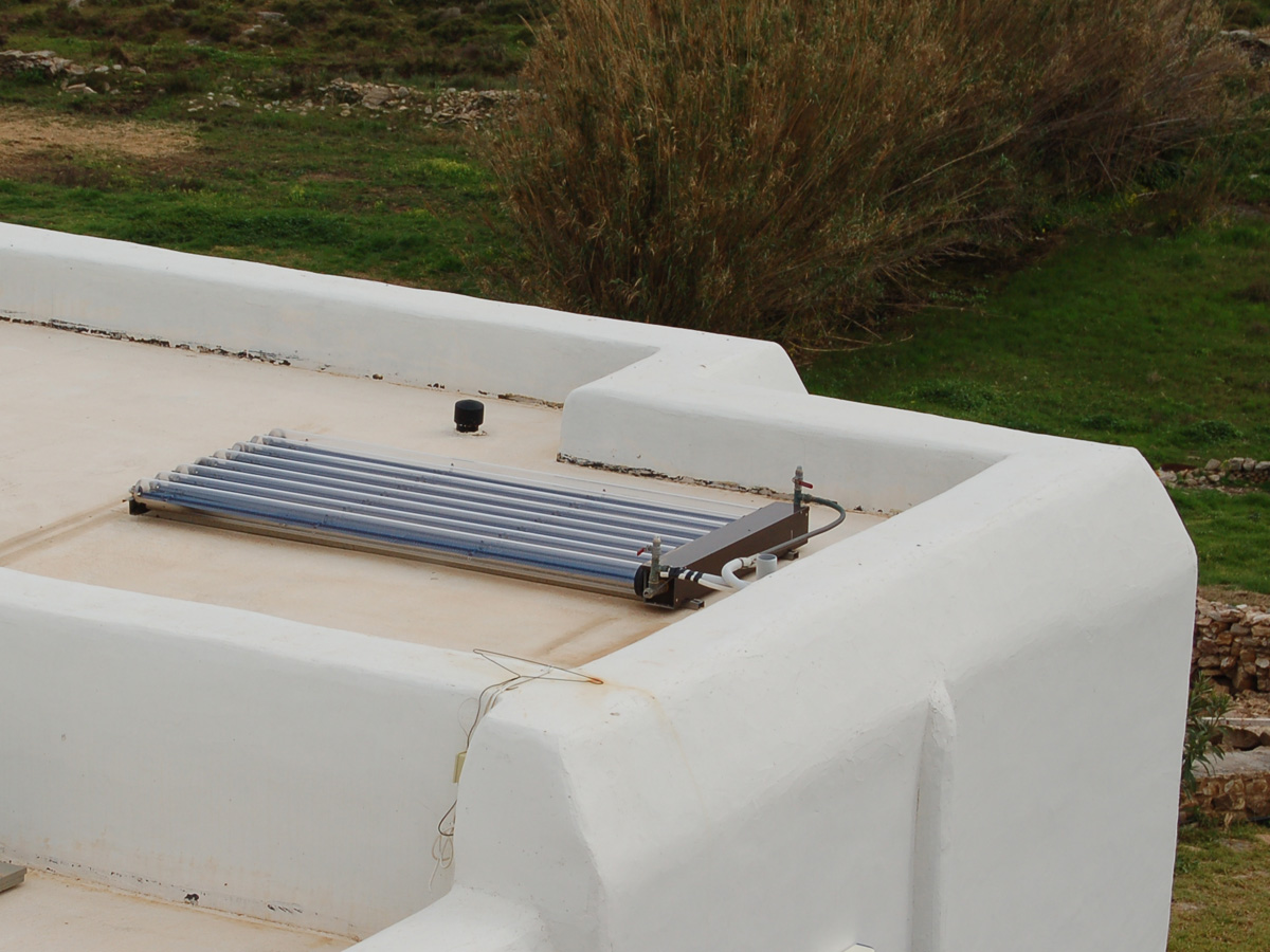 Εγκατάσταση ηλιακού συλλέκτη κενού - οριζόντια τοποθέτηση σε παραδοσιακό οικισμό για παραγωγή ζεστών νερών χρήσης.